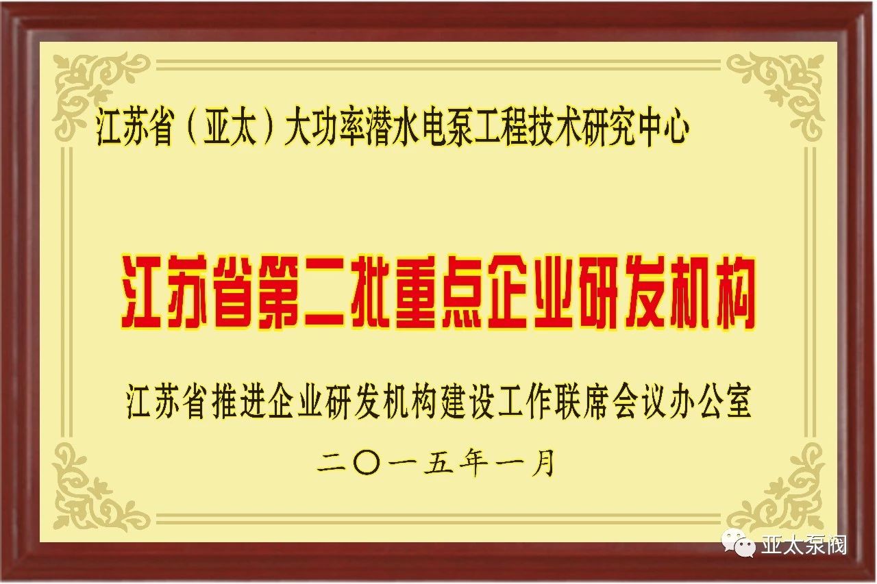 亞太泵閥有限公司是專(zhuān)業(yè)從事大功率潛水電泵及泵站系統(tǒng)研究的國(guó)家高新技術(shù)企業(yè),企業(yè)先后獲批國(guó)家博士后科研工作站、江蘇省企業(yè)技術(shù)中 心、江蘇省大功率潛水電泵工程技術(shù)研究中心、江蘇省研究生工作站等省級(jí)平臺(tái),技術(shù)創(chuàng)新能力顯著增強(qiáng),先后獲得國(guó)家科技二等獎(jiǎng)1項(xiàng)、省部級(jí)科技進(jìn)步獎(jiǎng)12項(xiàng)、承擔(dān)國(guó)家和省級(jí)研發(fā)項(xiàng)目11項(xiàng)、主持和參與制訂國(guó)家和行業(yè)標(biāo)準(zhǔn)8項(xiàng)。此次成功獲批省特大型潛水電泵及泵站系統(tǒng)工程研究中心,成為亞太泵閥第5個(gè)省級(jí)以上研發(fā)平臺(tái)。
